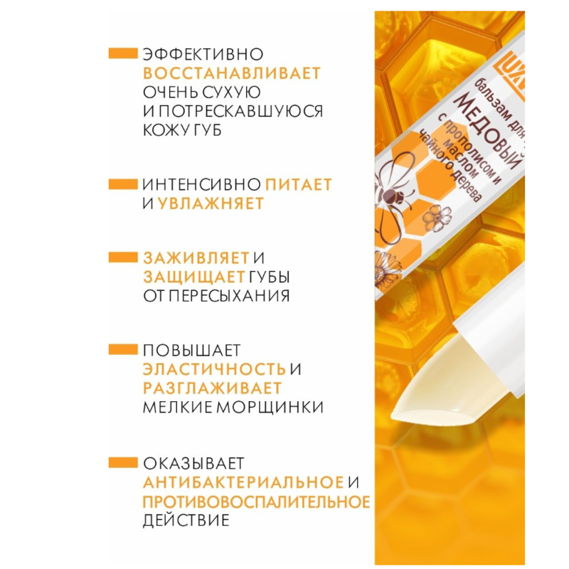 Прополис — уникальный продукт пчеловодства — заживляет и защищает от трещин, пересыхания и шелушения, а масло чайного дерева оказывает выраженное антибактериальное и противовоспалительное действие.