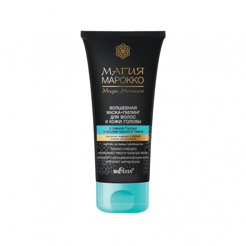 Комплекс активных компонентов (марокканская глина Гассул вулканического происхождения, масло черного тмина, экстракт моринги, антиоксидантный комплекс BioDTox, Crodabond, Sebaryl) волшебным образом действует на кожу головы и волосы: